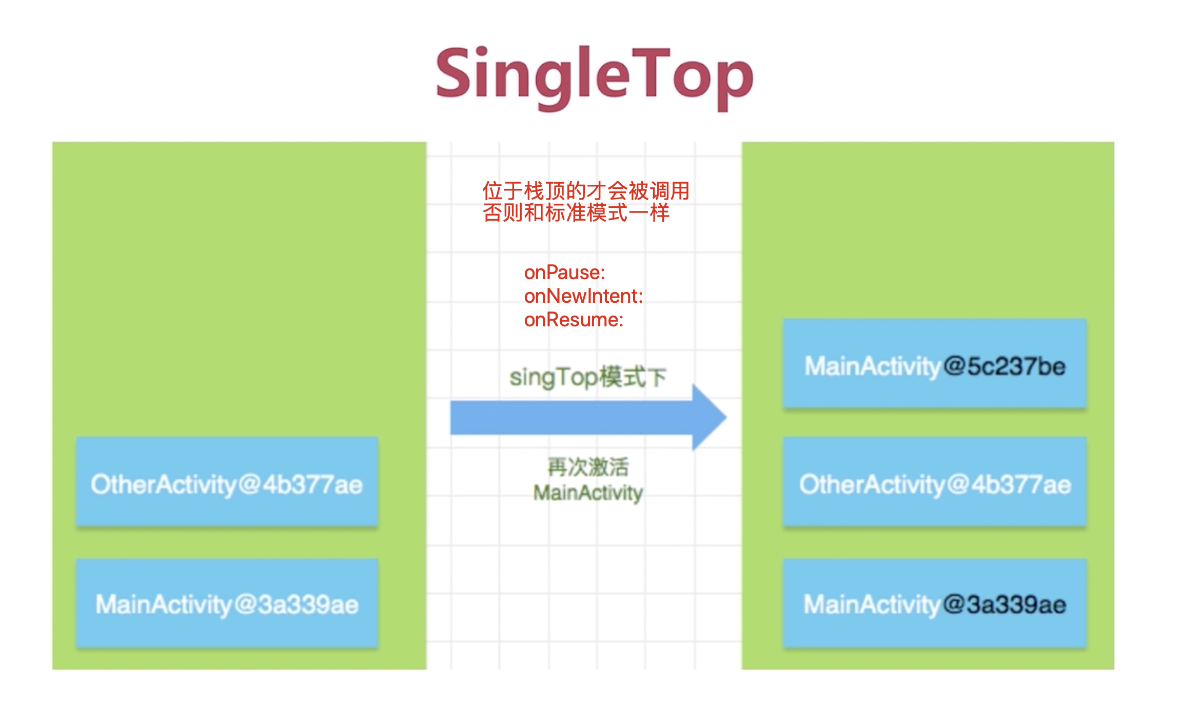 **含义**:分两种处理情况:需要创建的`Activity`已经处于栈顶时,此时会直接复用栈顶的`Activity`。不会再创建新的`Activity`;若须要创建的`Activity`不处于栈顶,此时会又一次创建一个新的`Activity`入栈,同`Standard`模式一样。