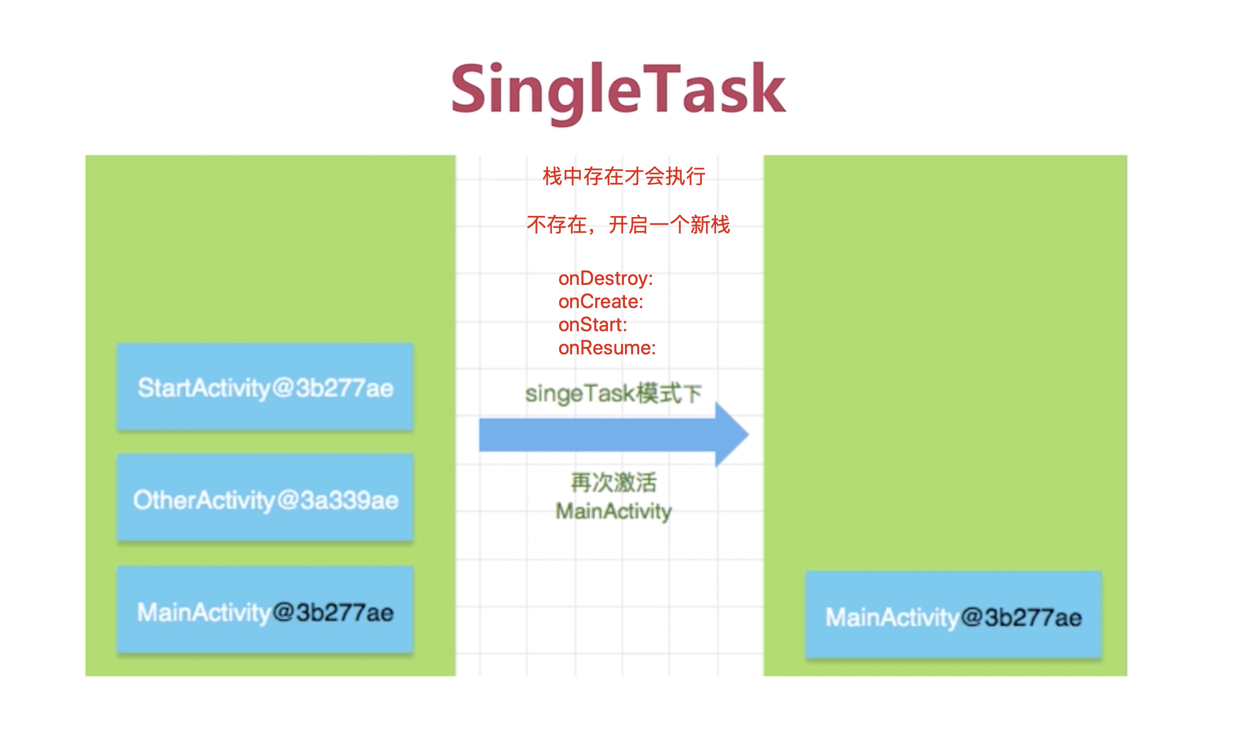 **应用场景**:这个经常使用于系统中的应用,比如`Launch`、锁屏键的应用等等,整个系统中仅仅有一个!所以在我们的应用中一般不会用到。常应用于独立栈操作的应用,如闹钟的提醒页面,当你在 A 应用中看视频时,闹钟响了,你点击闹钟提醒通知后进入提醒详情页面,然后点击返回就再次回到 A 的视频页面,这样就不会过多干扰到用户先前的操作了。
