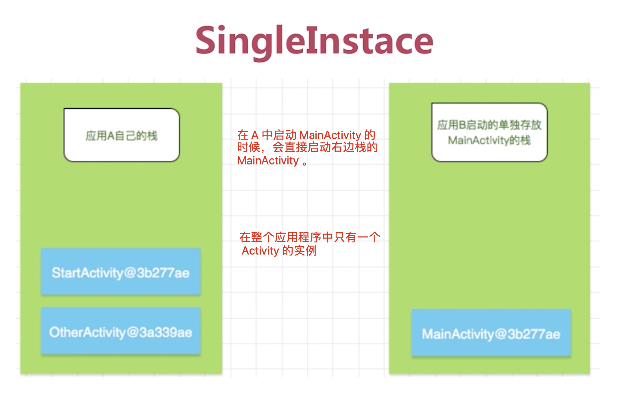 **含义**:是全局单例模式,是一种加强的`SingleTask`模式。它除了具有它所有特性外,还加强了一点:具有此模式的`Activity`仅仅能单独位于一个任务栈中。