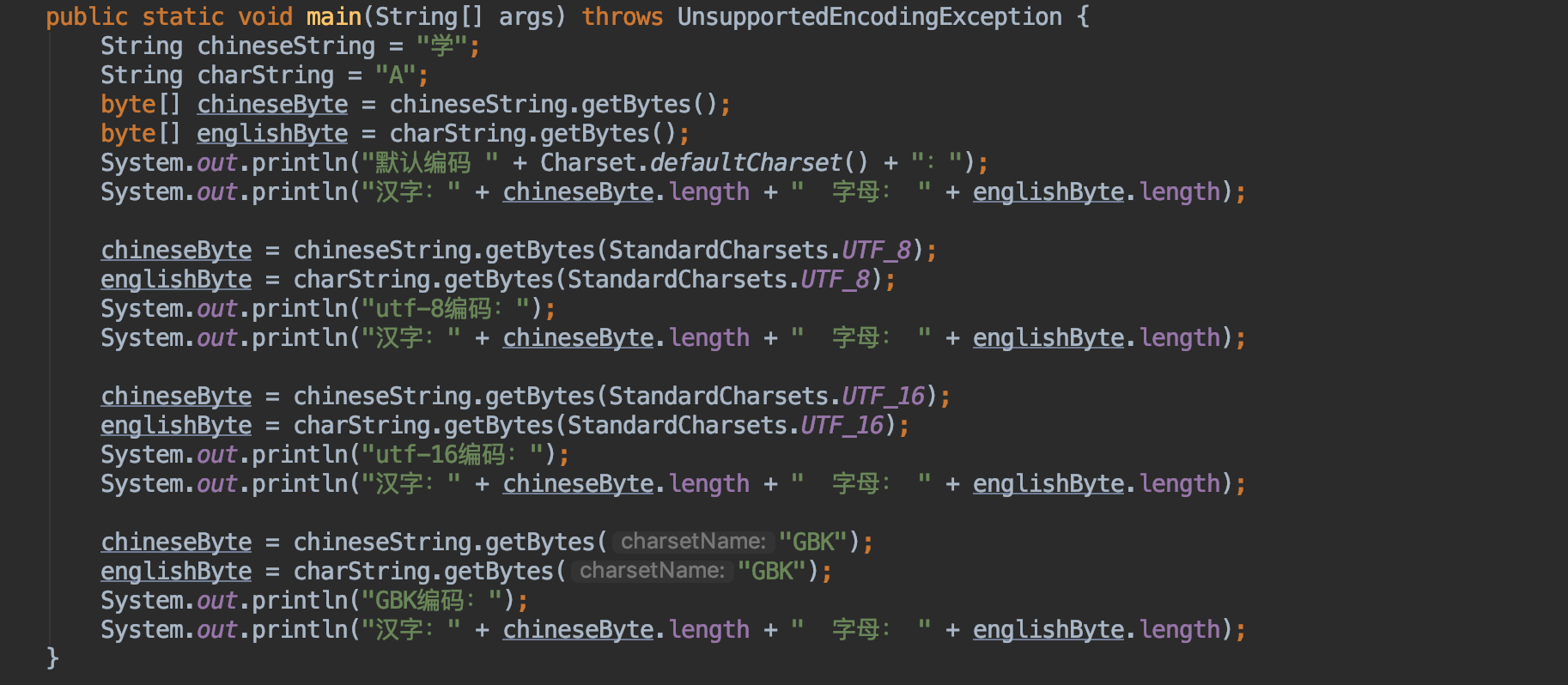 下面通过代码看一下 String 类型的汉字、字母分别在三种不同编码下占用的字节长度: