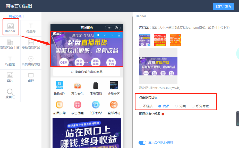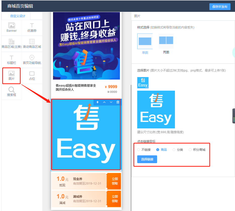 经过多次优化后再商城首页配置的地方可以放置单张图片,尺寸不限,并且可以链接商品和商品分类以及积分商城。