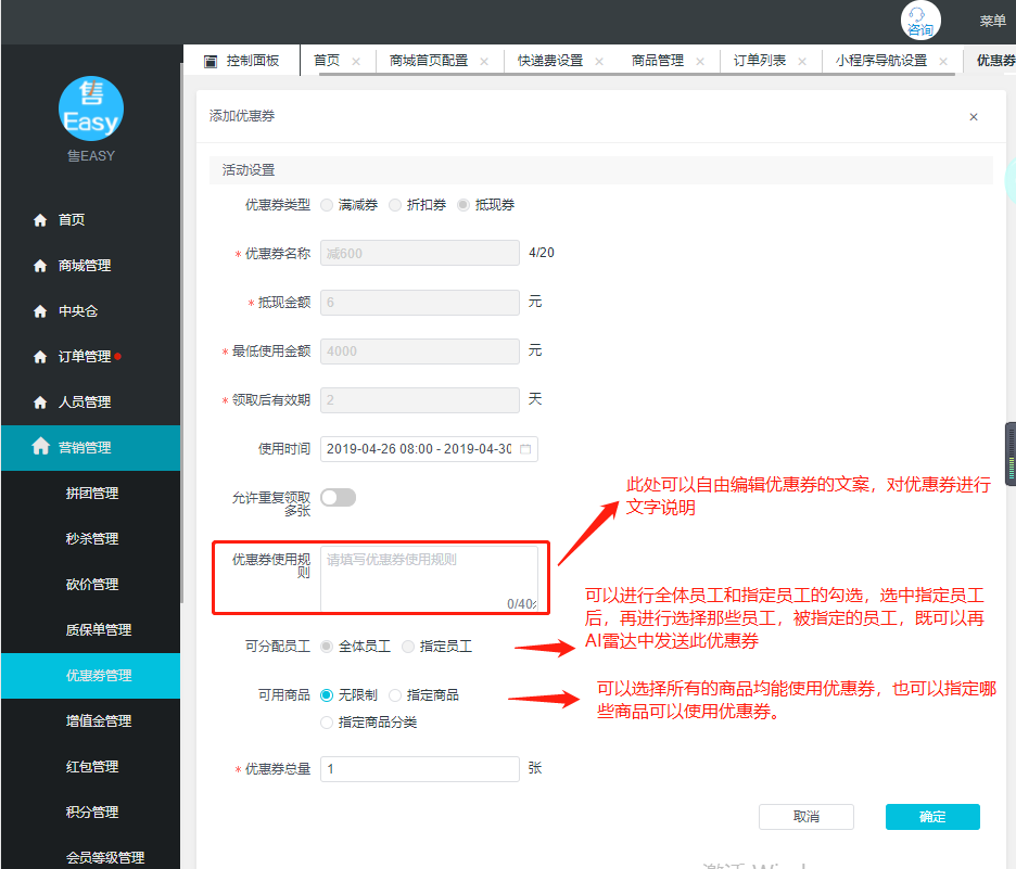 优惠券的生效层级是在所有的活动折扣之后最后生效,如果有金额限制才能使用优惠券,满足金额的条件为折扣前的价格,只要折扣前的价格足够,即可使用优惠券。优惠券分为满减、折扣和抵现,商户需要设置其最低使用金额,并设置其可用时间。优惠券分配的员工只影响员工在AI雷达给客户发送优惠券的时候,不影响客户在商城领取优惠券。