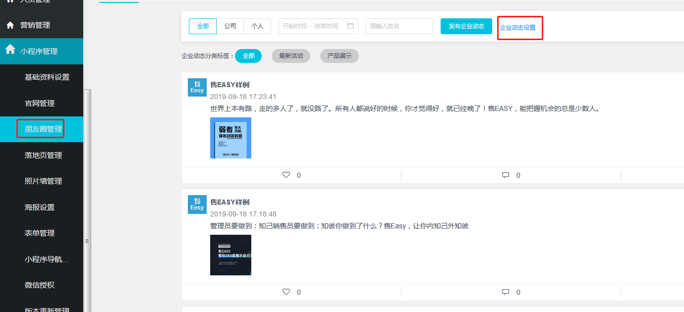 在【小程序管理】-【朋友圈管理】中,点击【发布企业动态】进行编写。发布成功的企业动态,将在所有员工名片中显示。