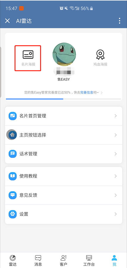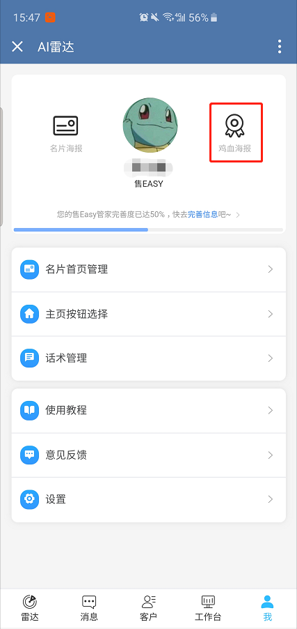 同样在进入AI雷达我的页面时,点击鸡血海报进行筛选,可生成多样化的激励式海报。根据个人选择喜欢的模板进行保存分享,售easy默认的海报图库就有40余张,商家也能在企业后台设置自己的海报图库,并且支持自定义上传图片生成海报保存分享。