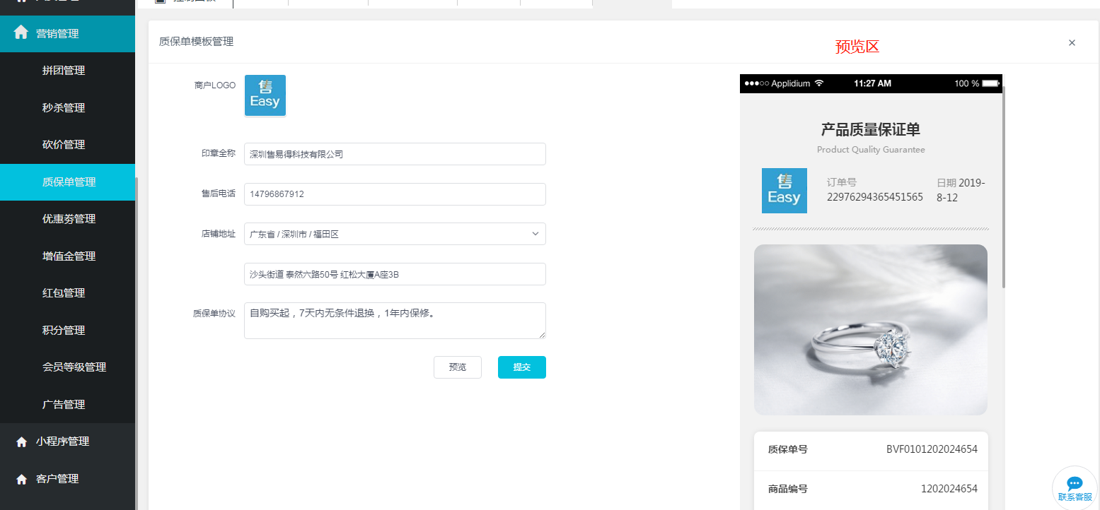 在【营销管理】-【质保单管理】中,点击【质保单模板管理】进行添加。