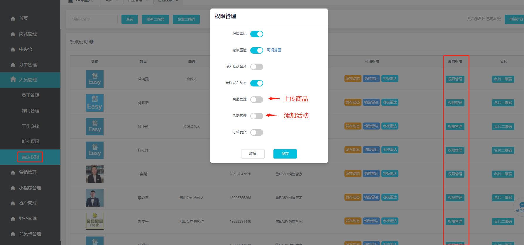 首先需要在企业后台,【人员管理】-【雷达权限】中给这位员工开启权限。