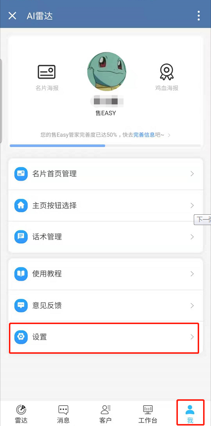 进入AI雷达,打开底部导航【我】,点击【设置】选择【名片分享文案设置】,开始文案的编辑。