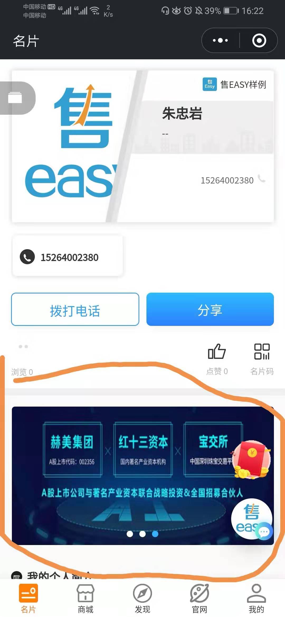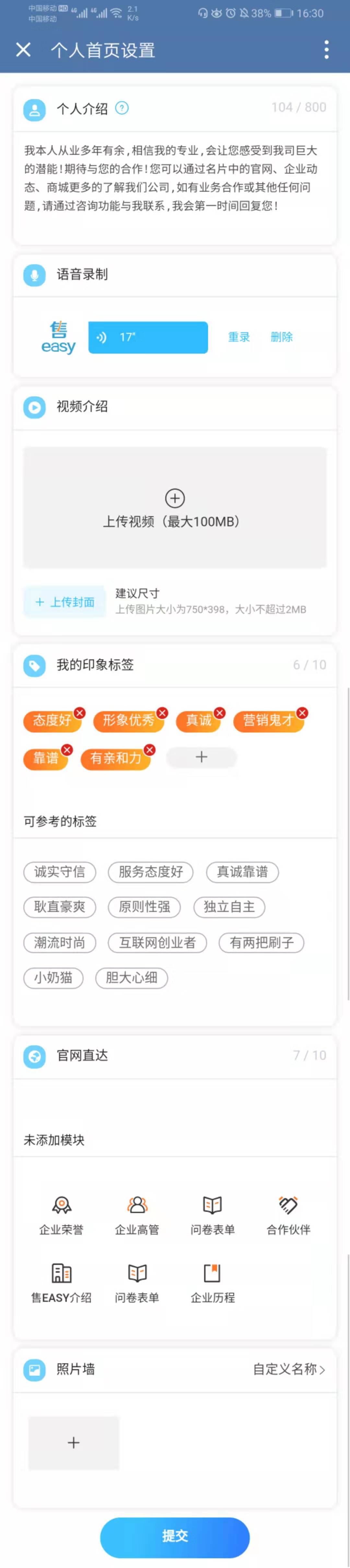 可以添加视频,照片等内容;这里添加的信息只有在被添加者的名片中可以看到,并且显示位置优先于【企业后台——照片墙】的照片。