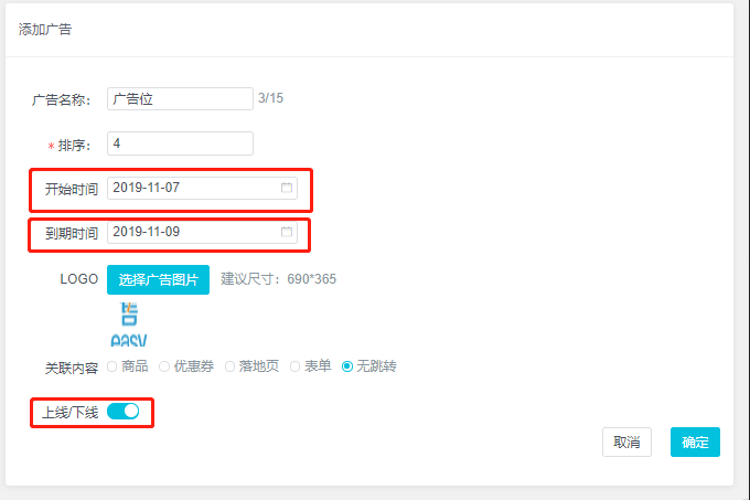 这里需要注意的是【排序】数字越大越靠前;【开始时间】默认的是明天,所以要进行点击选择,【到期时间】默认的是几天不等,所以要进行选择;【LOGO】在添加的时候图片大小是 640*339 ;【关联内容】根据需求选择;然后点击【上线】,最后点击【确定】即可。