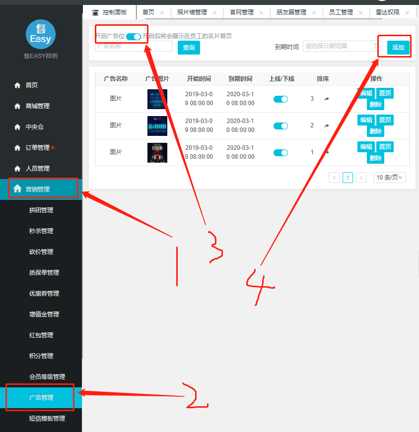 # 2. 打开【营销管理】——【广告管理】,添加广告轮播图。