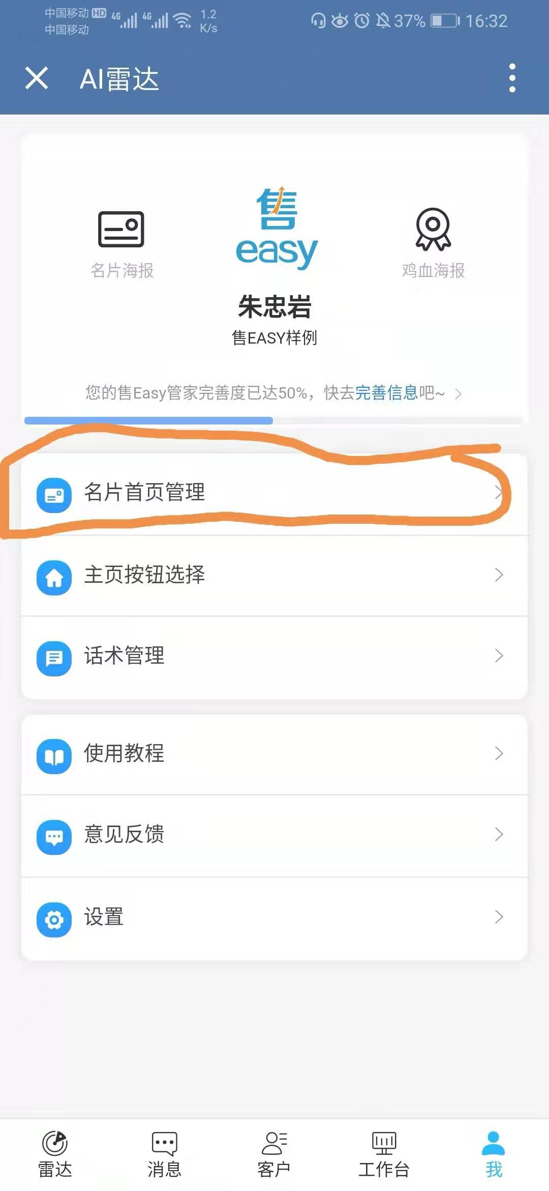 这里需要名片本人下载企业微信进行操作,具体步骤打开【企业微信】——【工作台】——【AI销售雷达】——【我】,点击【名片首页管理】