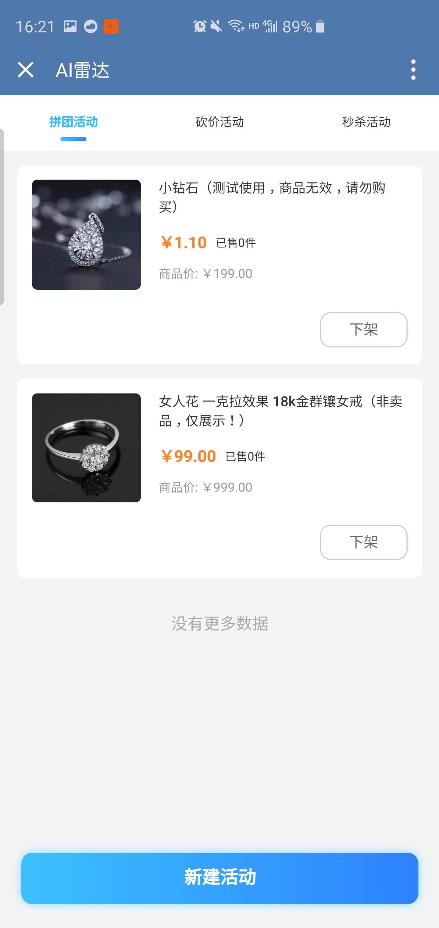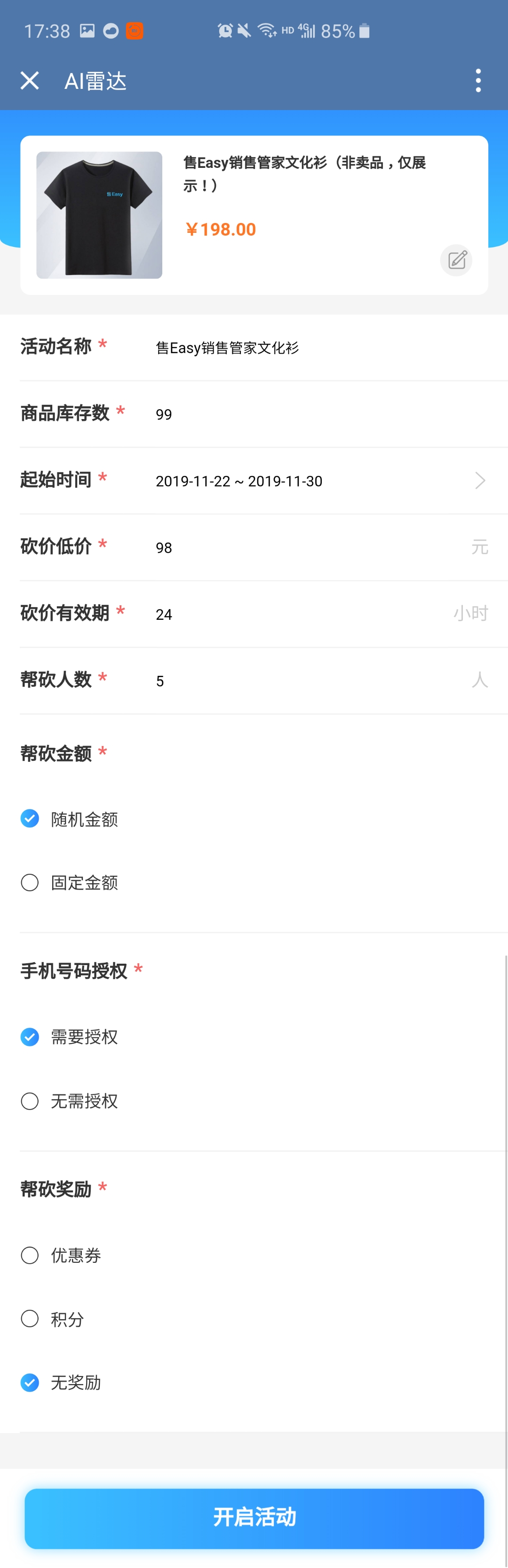 点击【新建活动】后选择【砍价活动】,按照相应的提示填入数据,最后点击【开启活动】即可发布成功。