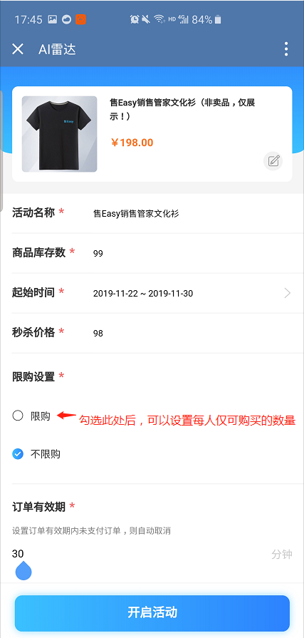 点击【新建活动】后选择【秒杀活动】,按照相应的提示填入数据,最后点击【开启活动】即可发布成功。