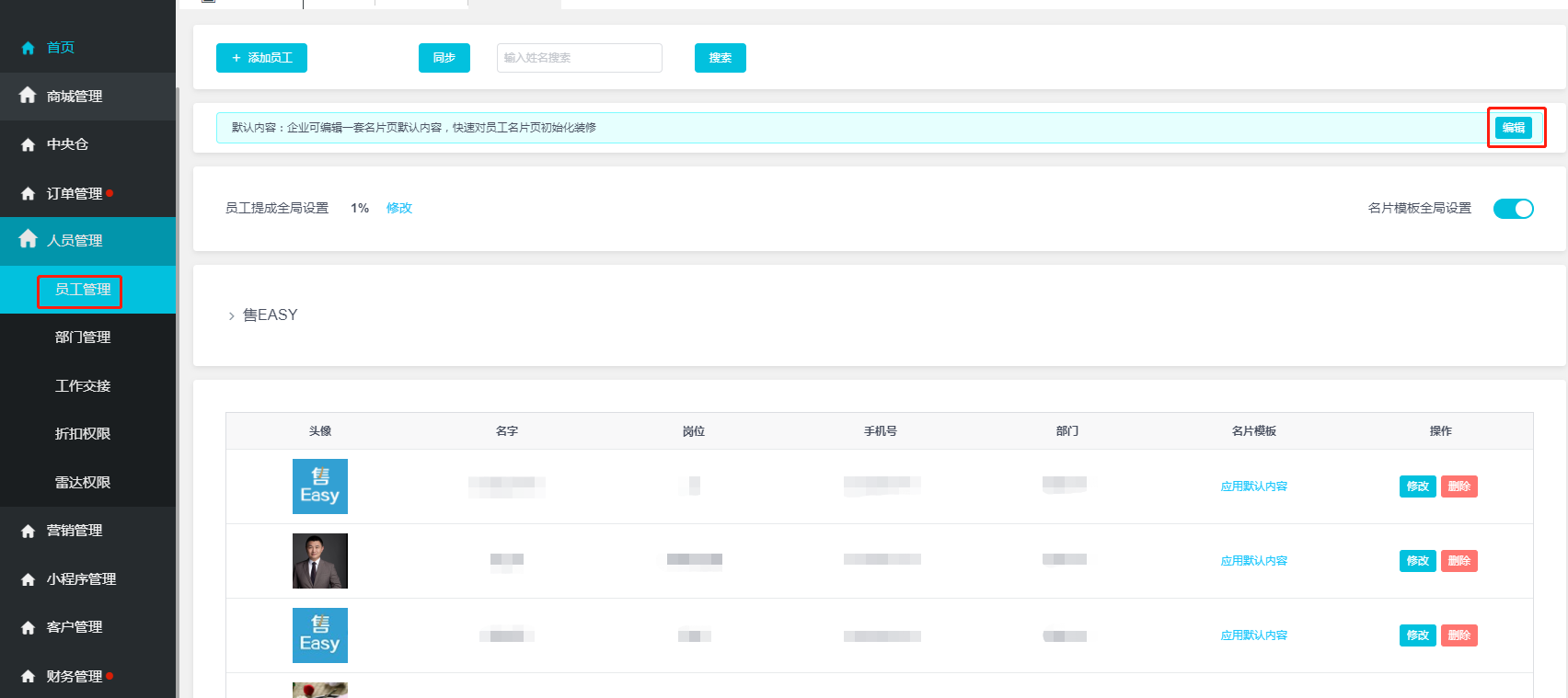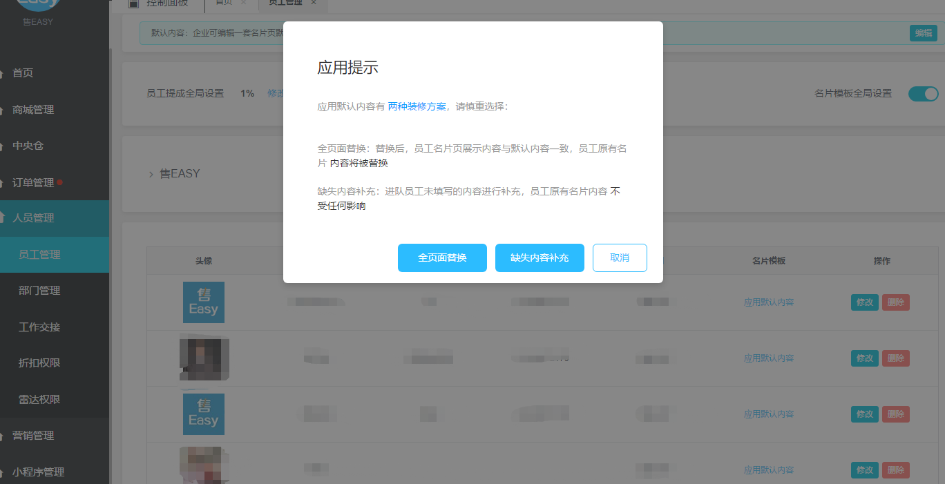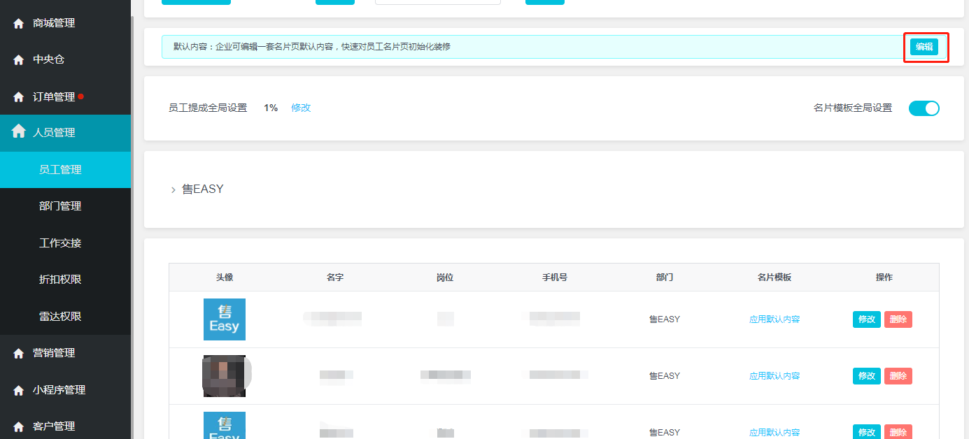 **功能描述:** 为了提高企业对销售员的管控及运维效率,我们在后台人员管理的员工管理中,新添加了对新增员工以及现有员工实行一体化的智能名片首页内容呈现的设计功能,您在招兵买马之后,再也不用担心员工不会设置智能名片的问题了。与此同时,我们在这个页面上也增加了新员工添加权限的快速通道,让您管理员工更顺心。