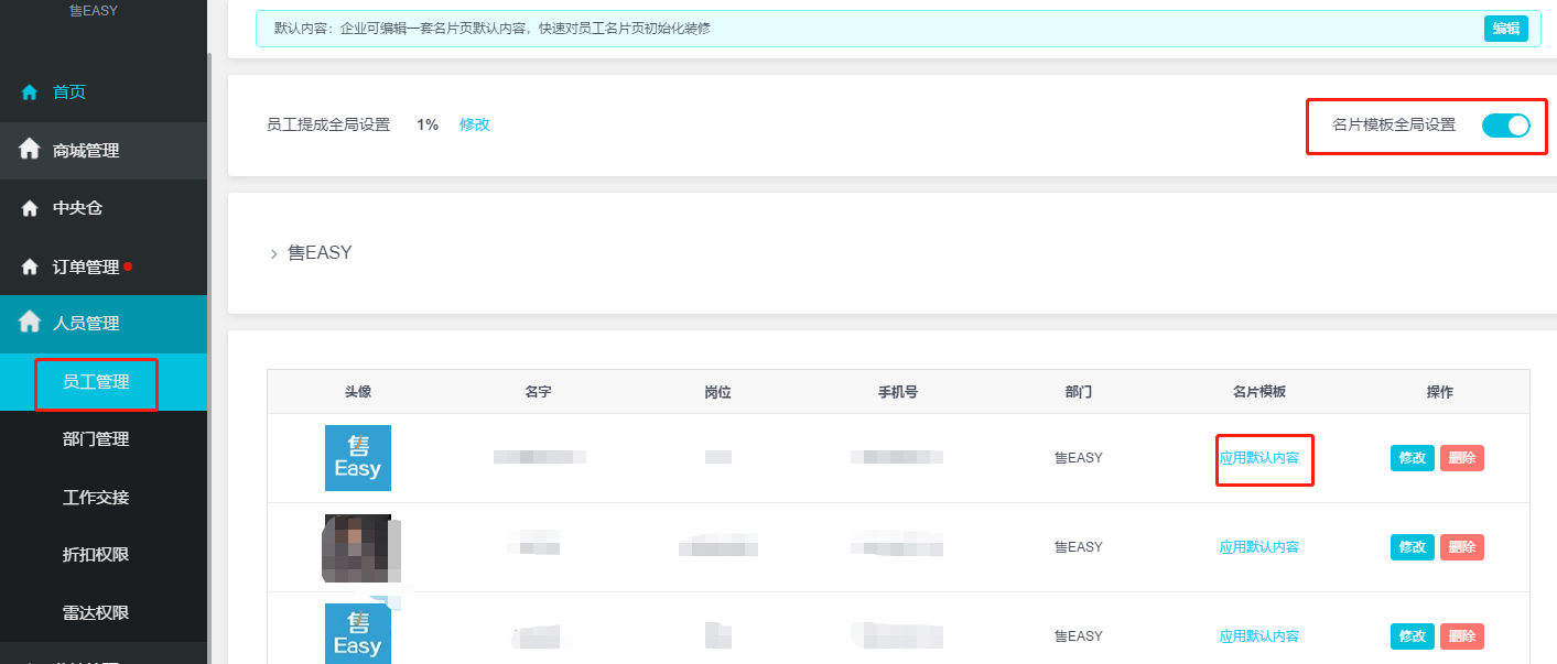 首先需要先将 **【名片模板全局设置】** 按钮打开,然后其中一位员工点击 **【应用默认内容】** 。