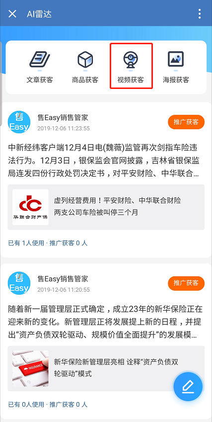 **功能描述:** 现在售Easy销售管家开发的视频拓客功能可以直接使用优质的短视频进行推广,不仅增加了您和您的客户之间的粘度,还能精准分析您客户的爱好和进入您商城的路径。