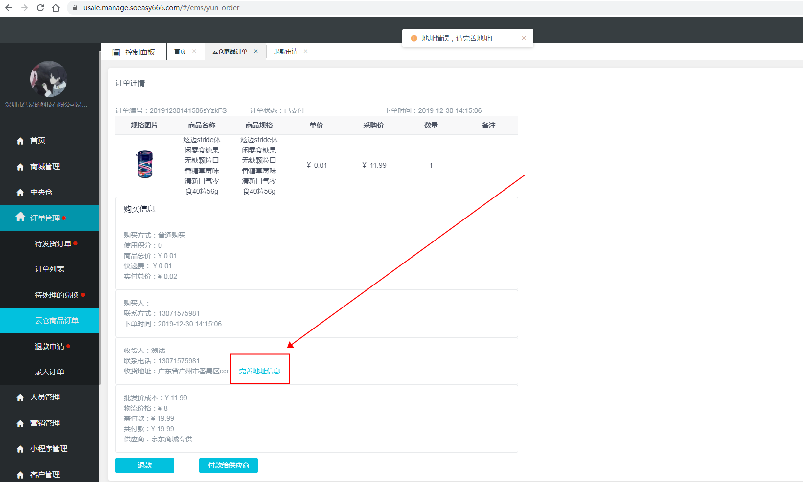 如果在付款时出现地址有误的问题,例如下图