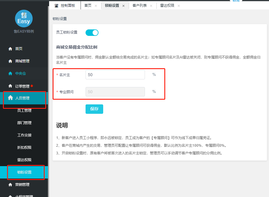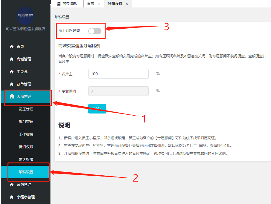 注:拿到专属顾问佣金前提需:管理员先设置『商城交易佣金分配比例』,若不设置佣金分配,此锁粉功能有无开启并无差异。
