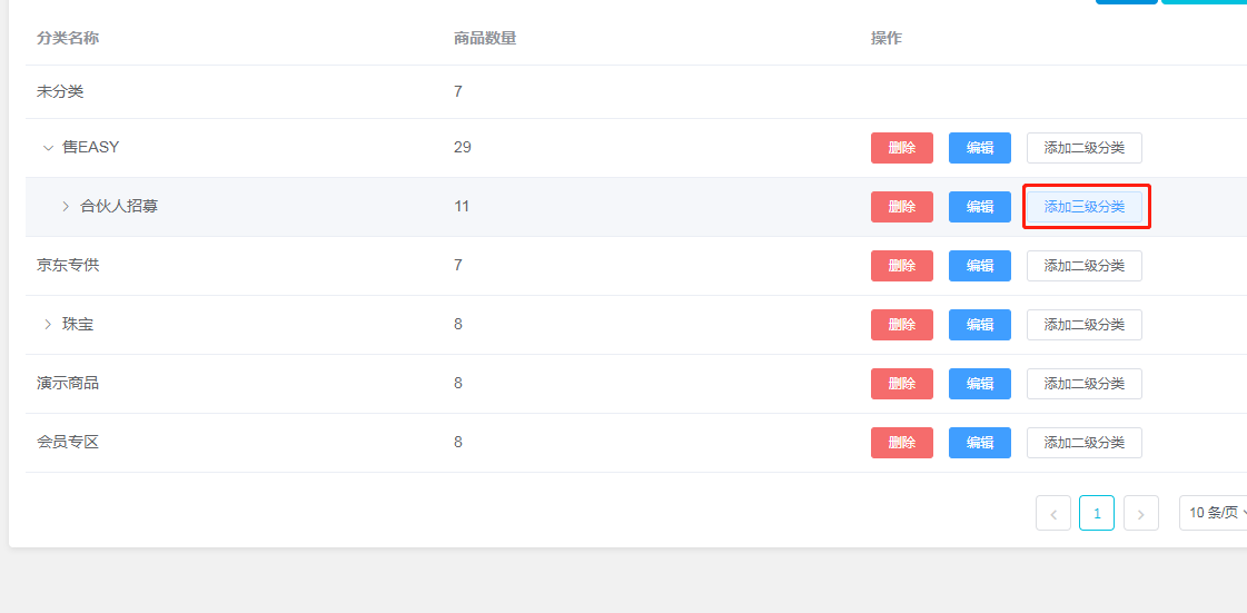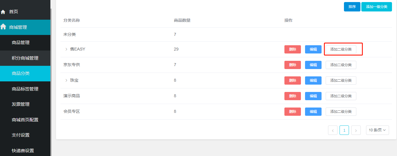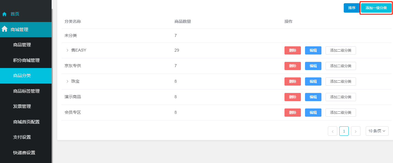 在【商城管理】——【商品分类】中,点击【添加一级分类】按钮,开始添加商品分类。