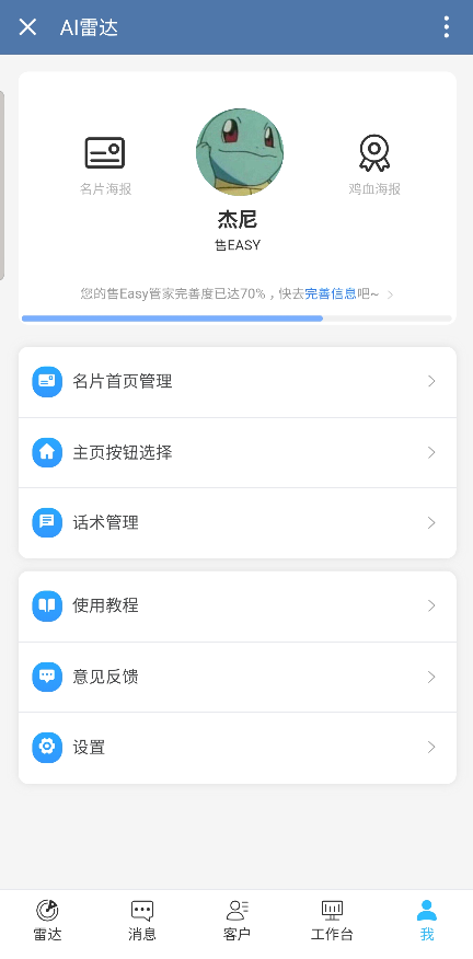 内有“雷达、消息、客户、工作台、我”等五个板块。