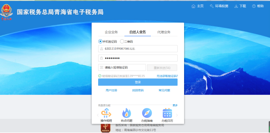 用户输入身份证号码、密码和验证码后,点击登录,进入系统办理业务。