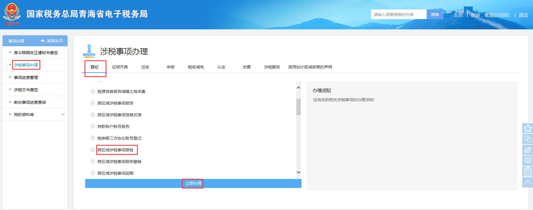 事项办理→涉税事项办理→登记→跨区域涉税事项报验→立即办理