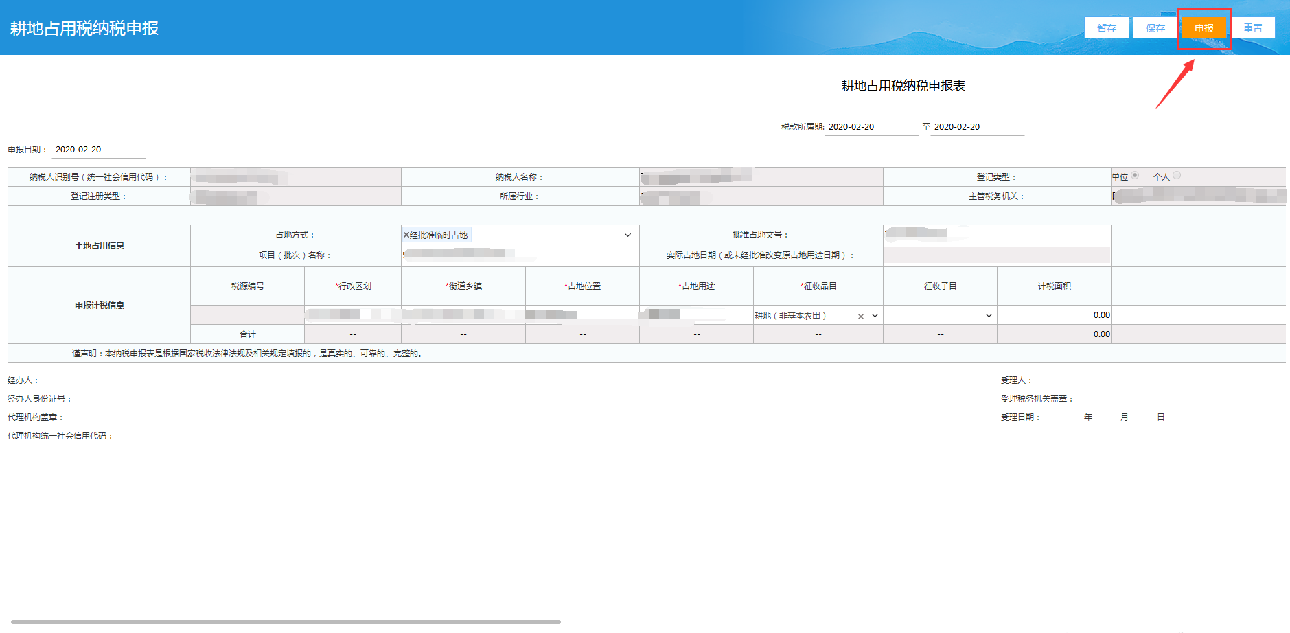 登录→电子税务局→我要办税→税费申报及缴纳→其他申报→耕地占用税纳税申报表→填写申报表→完善信息→保存→申报→申报成功
