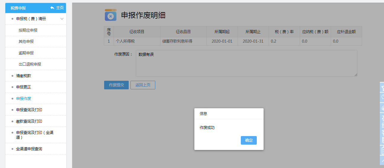 税费申报→申报作废→输入申报日期起止→查询→申报作废→填写作废原因→作废提交→作废成功→确定