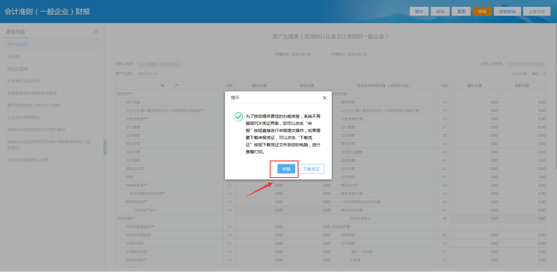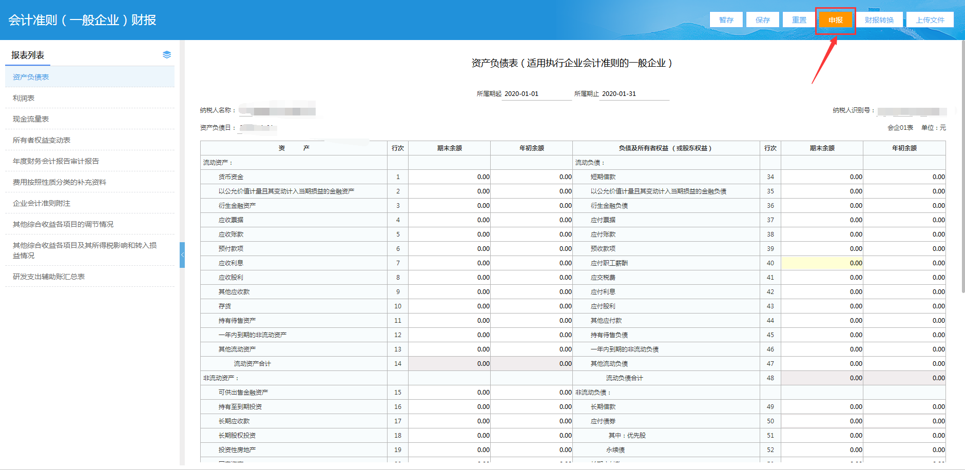 登录→电子税务局→我要办税→税费申报及缴纳→财务报表报送→企业会计准则→填写财报→下一步→填写数据→保存→申报→申报成功