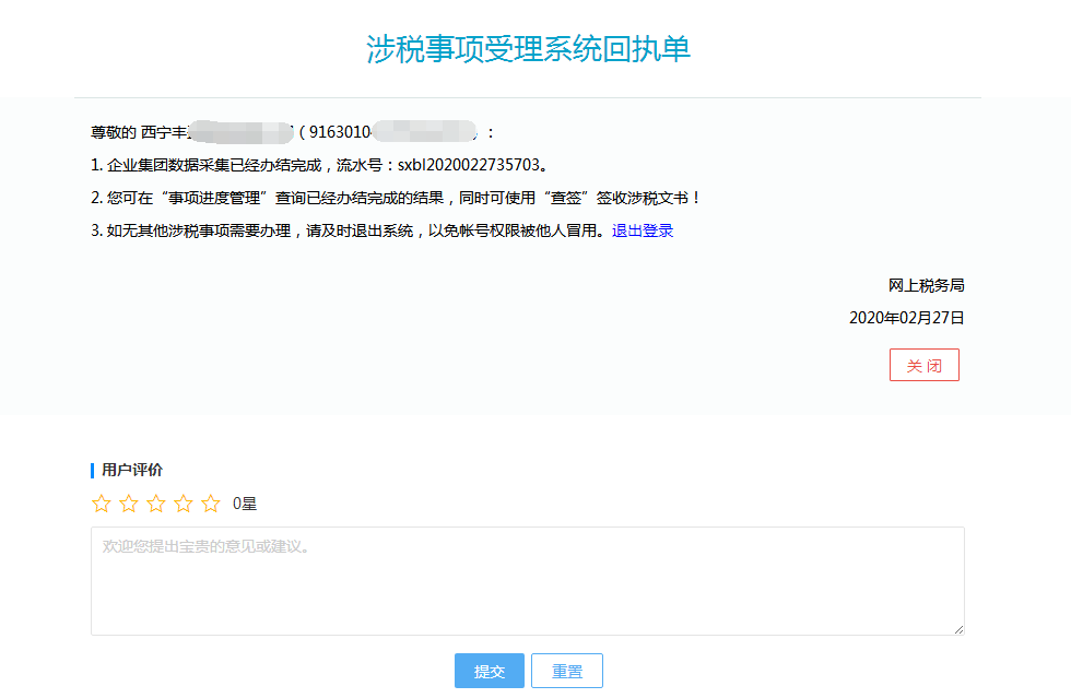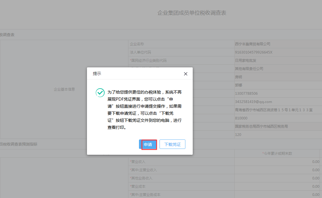 企业集团税收调查表→完善信息→保存→下一步→申请→生成回执单