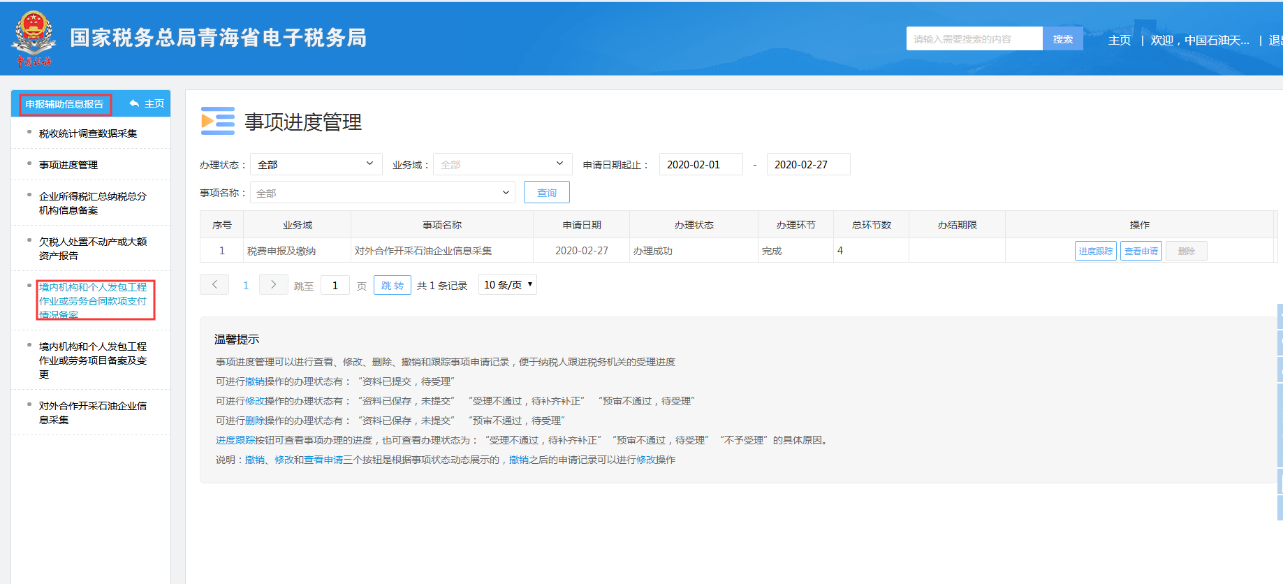 登录→电子税务局→我要办税→申报辅助信息报告→境内机构和个人发包工程作业或劳务项目备案