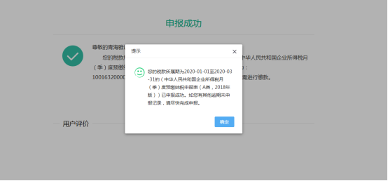5.申报完成,回执页提示报表申报成功,并且有其他逾期未申报信息尽快申报。点击【关闭】,退出提交回执页面。