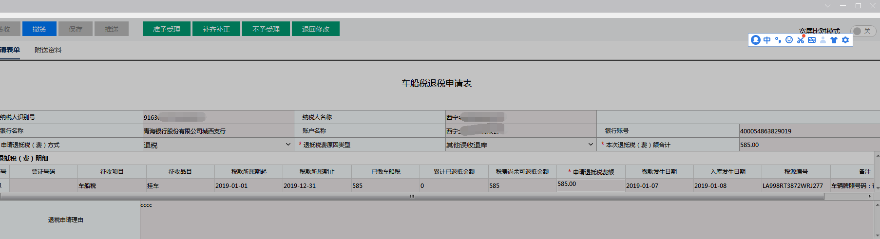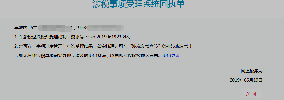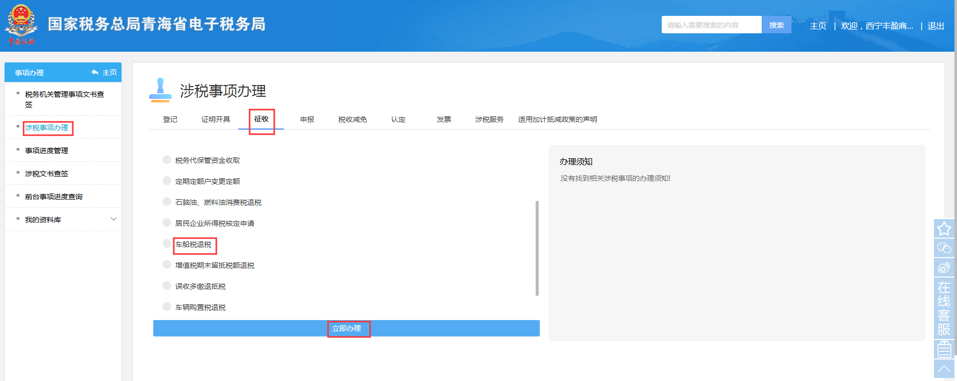 登录→电子税务局→我要办税→事项办理→涉税事项办理→征收→车船税退税→立即办理