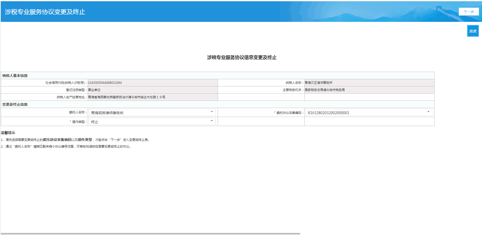 涉税专业服务协议信息变更及终止→确认信息→下一步→完善信息→保存→下一步→申请→生成回执单