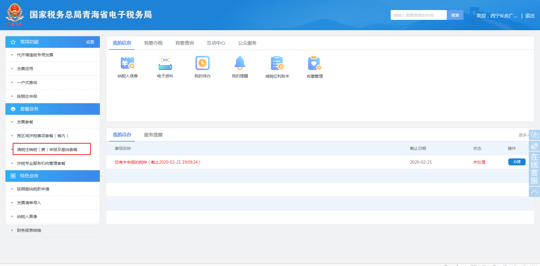 登录→电子税务局→套餐业务→清税注销税(费)申报及缴纳套餐