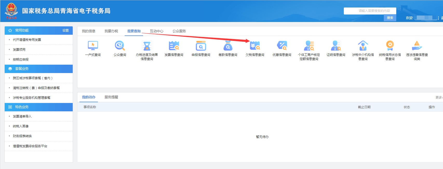 登录→电子税务局 →我要查询→ 欠税信息查询