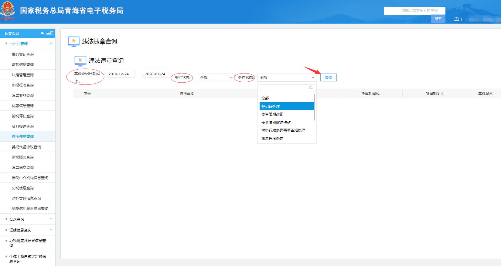 登录→电子税务局 →我要查询→违法违章信息查询