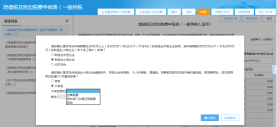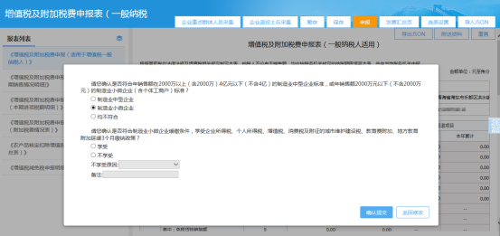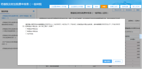 提示“请您确认是否符合年销售额在2000万以上(含2000万)4亿元以下(不含4亿)的制造业中型企业标准,或年销售额2000万元以下(不含2000万元)的制造业小微企业(含个体工商户)标准?”,并提供“制造业中型企业”、“制造业小微企业”、“均不符合”三个选项供纳税人选择。