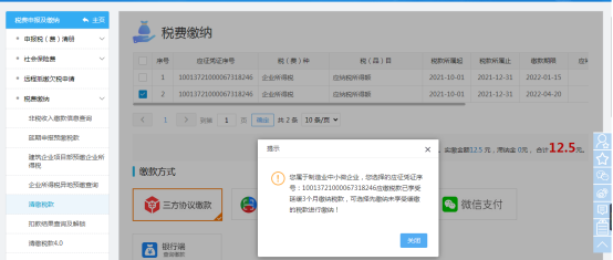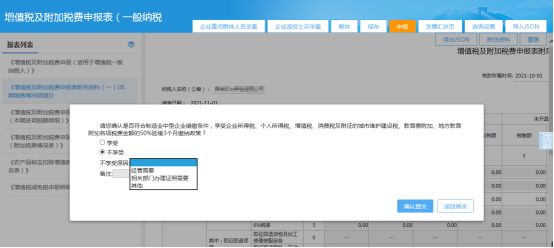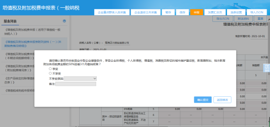 (2)对制造业中型企业纳税人,提示内容为“纳税人符合制造业中型企业延缓缴纳条件,本次申报是否享受企业所得税、个人所得税、增值税、消费税及附征的城市维护建设税、教育费附加、地方教育附加税50%税费额延缓3个月缴纳的政策?”