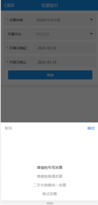 2.选择需要验旧的发票种类、开票月份、开具日期起止时间,点击查询。