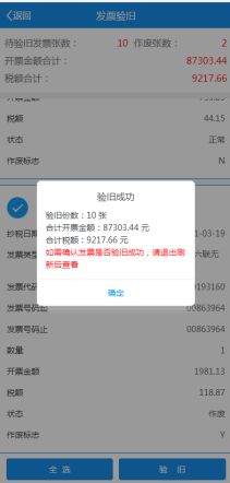 4.确认发票信息无误点击验旧,显示验旧成功。