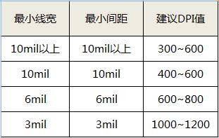 答:主要看板子的线宽与线距,间距越大则可选用越小的DPI ,通常我们如下处理,大家可以参考一下 ,如果非高密度板可以盲扫600或800。