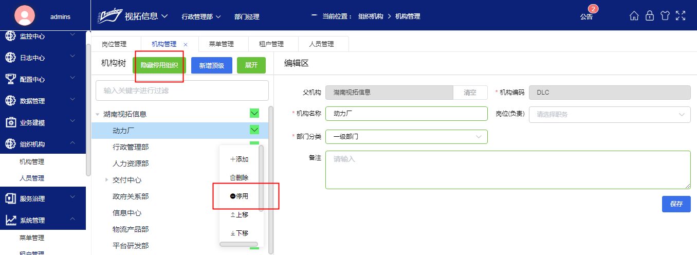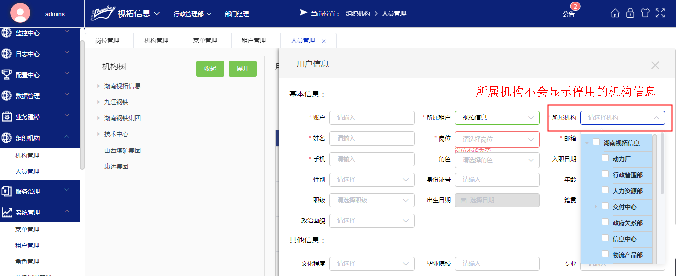 停用机构后,在相应模块“租户管理,人员管理”等就不会显示该机构进行选择;如下图所示: