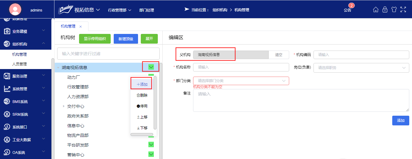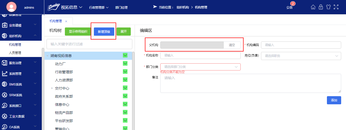 新增顶级机构,顶级机构是没有父机构如下图所示: