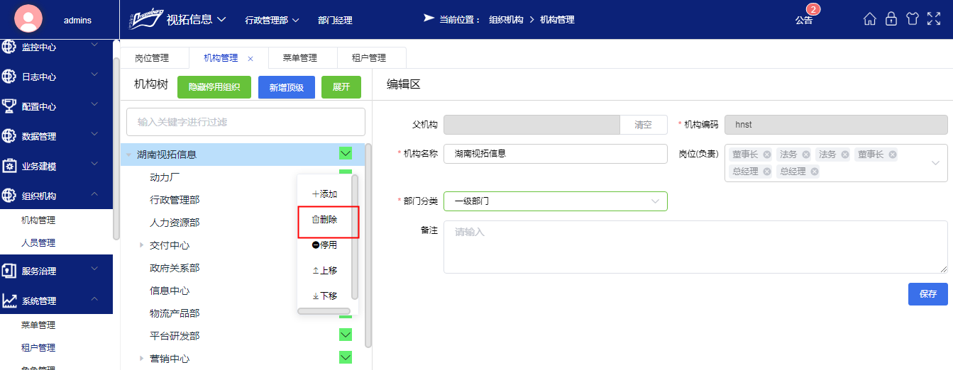 不可直接删除有子机构的机构,需要先删除子机构;如下图所示: