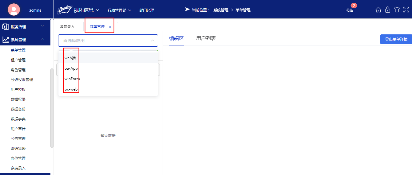 给菜单管理进行分类;可分为App端、Web端等类型;如下图所示: