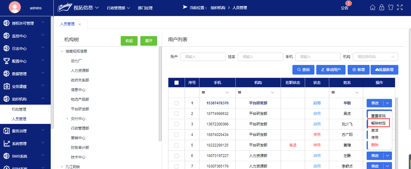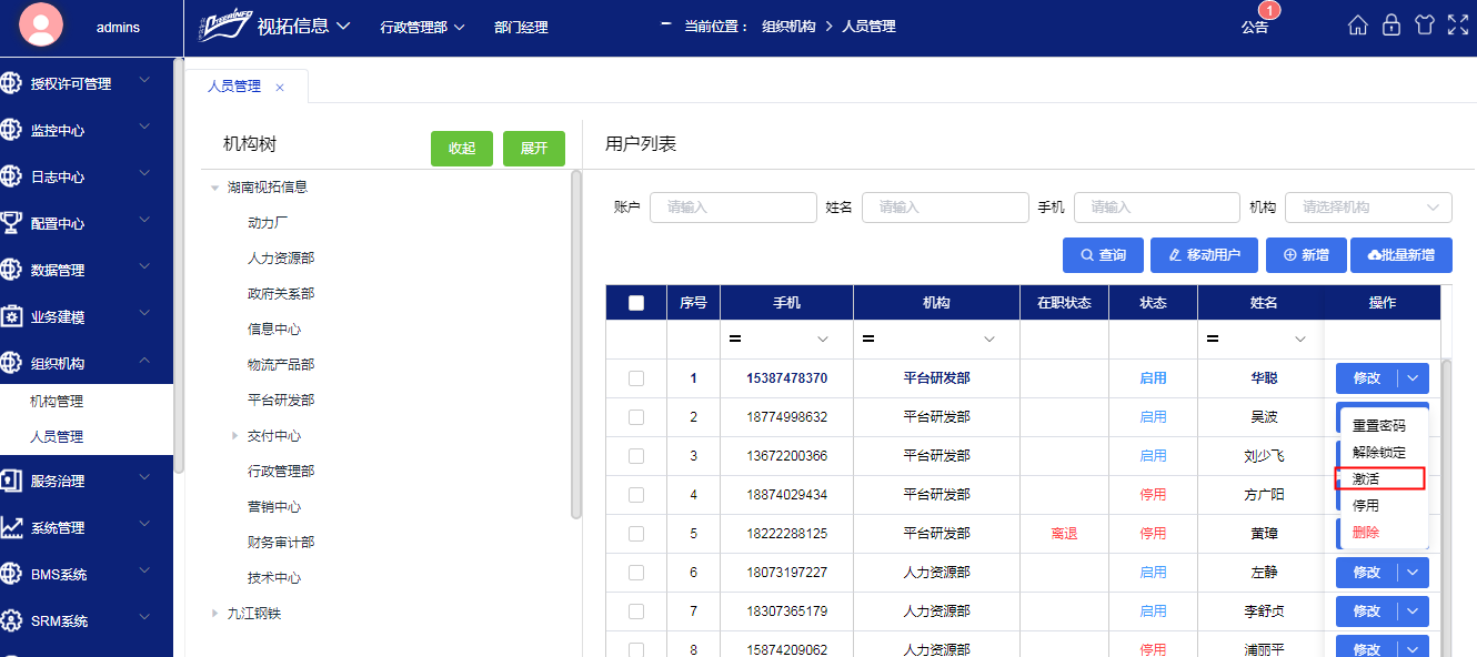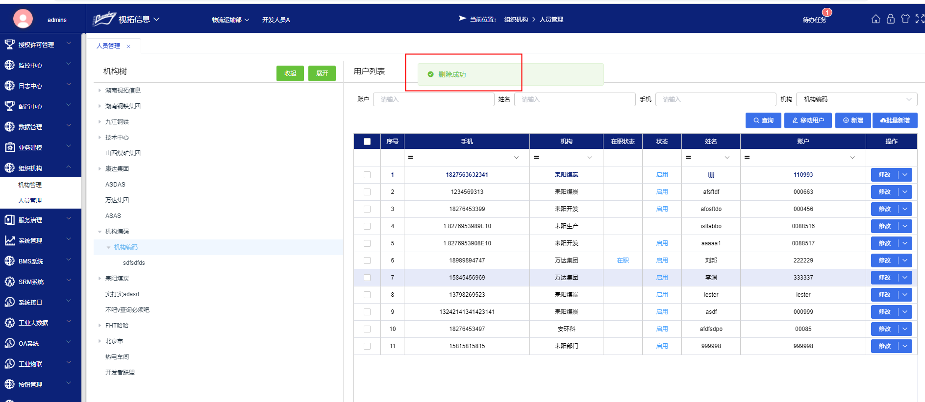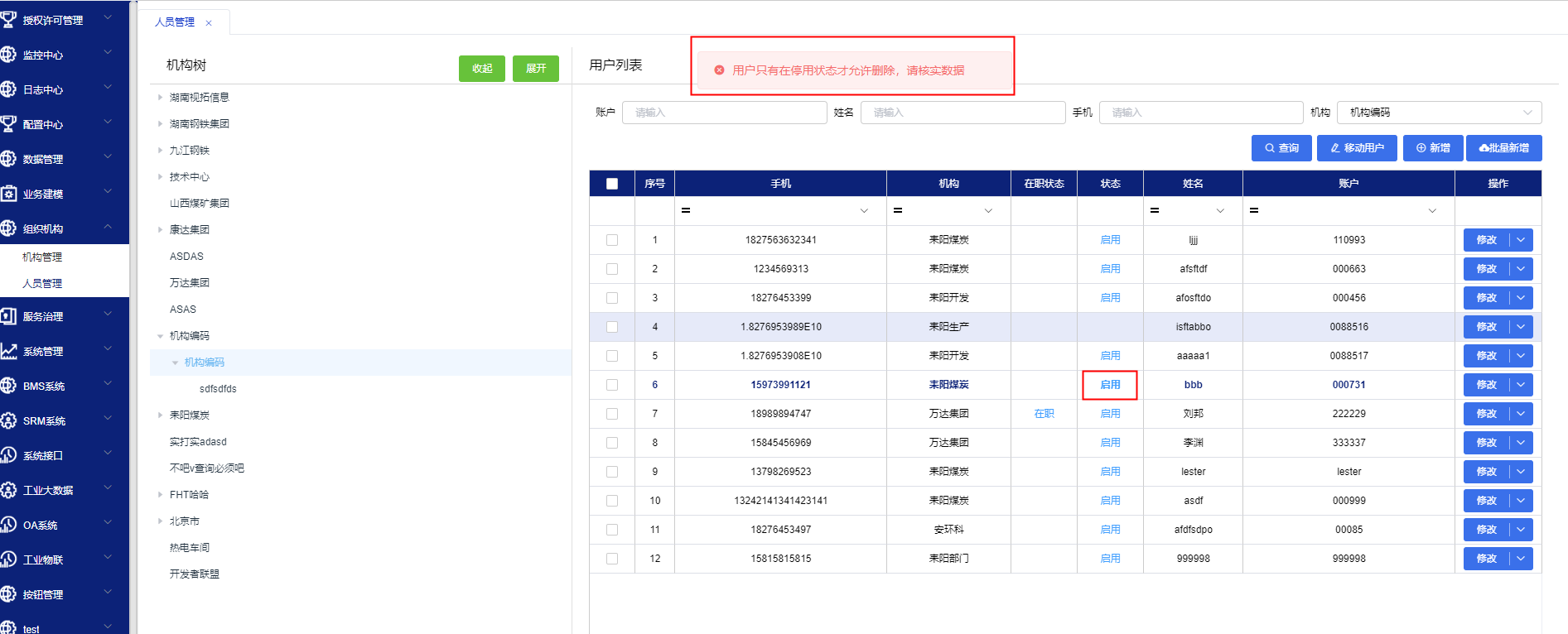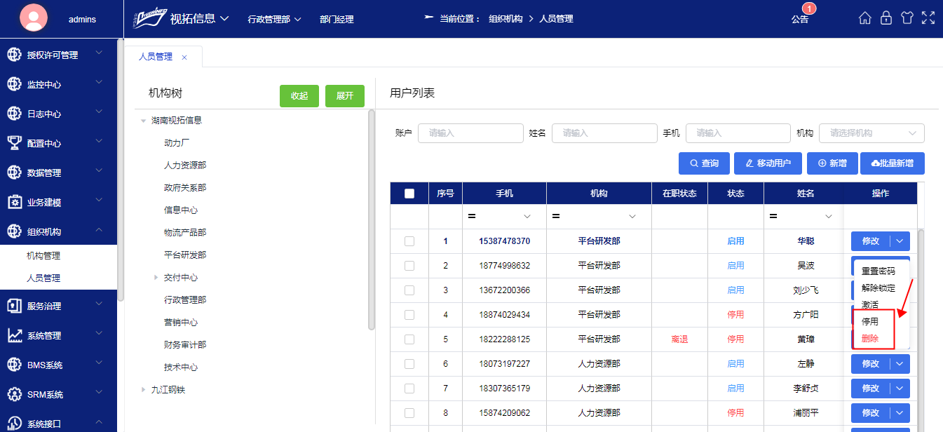 用户删除采用的是逻辑删除(逻辑删除就是删除成功后,只是人员管理的用户列表查不到该用户数据,数据库可以查到该用户信息),只能删除状态是“停用”的用户,被删除的用户不可再登录访问平台;如下图所示: