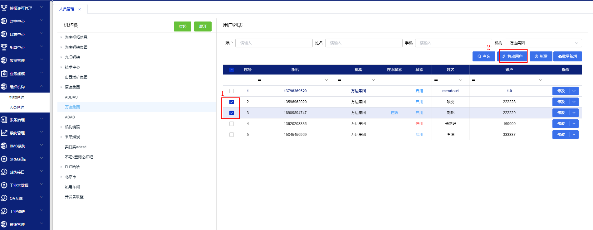 可以把一个机构下的用户移动到另一个机构下;选择一个或多个用户,再点击“移动用户”按钮;如下图所示: