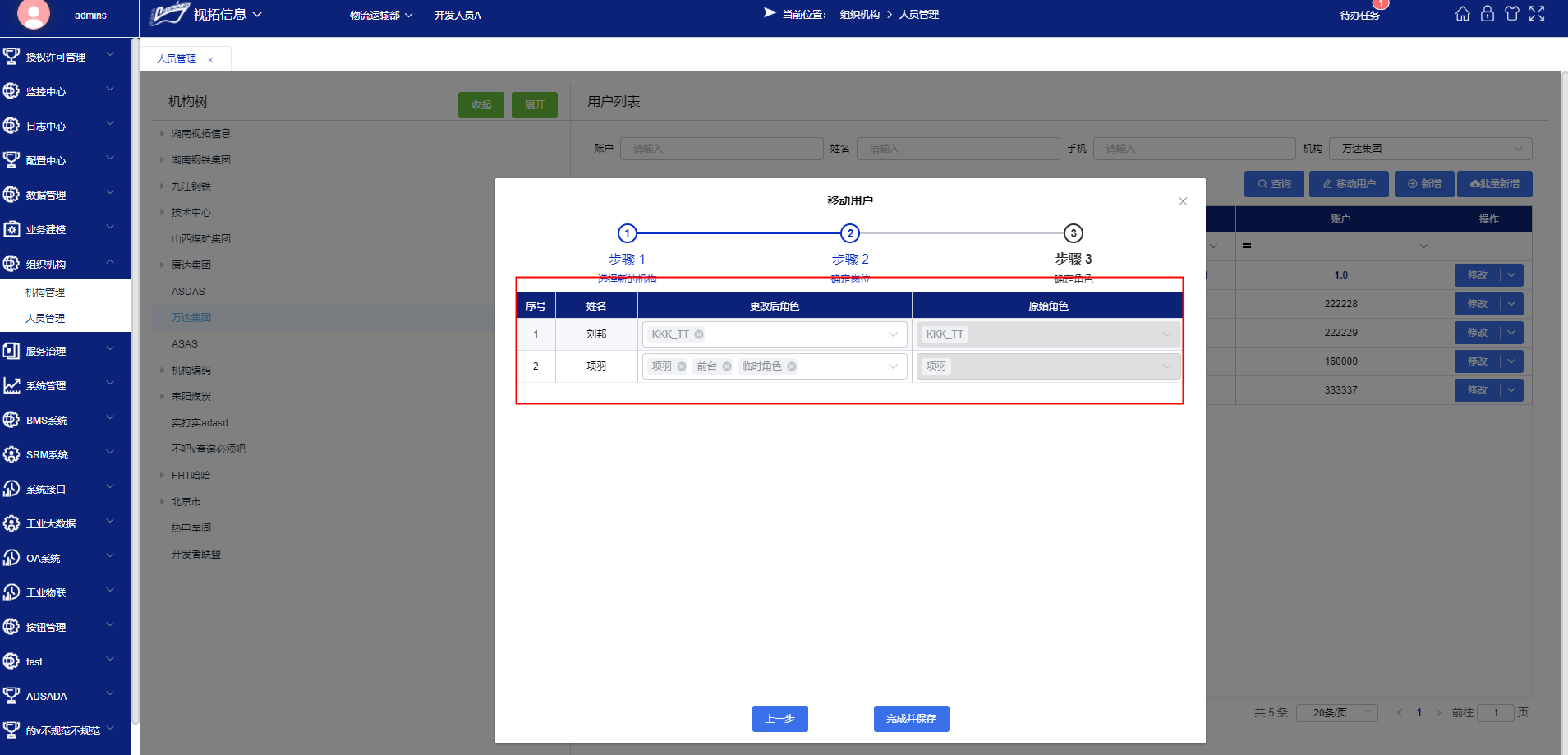 点击“下一步"按钮进入确定角色界面;一个用户可有多个角色;再点击“完成并保存”按钮完成移动用户,如下图所示: