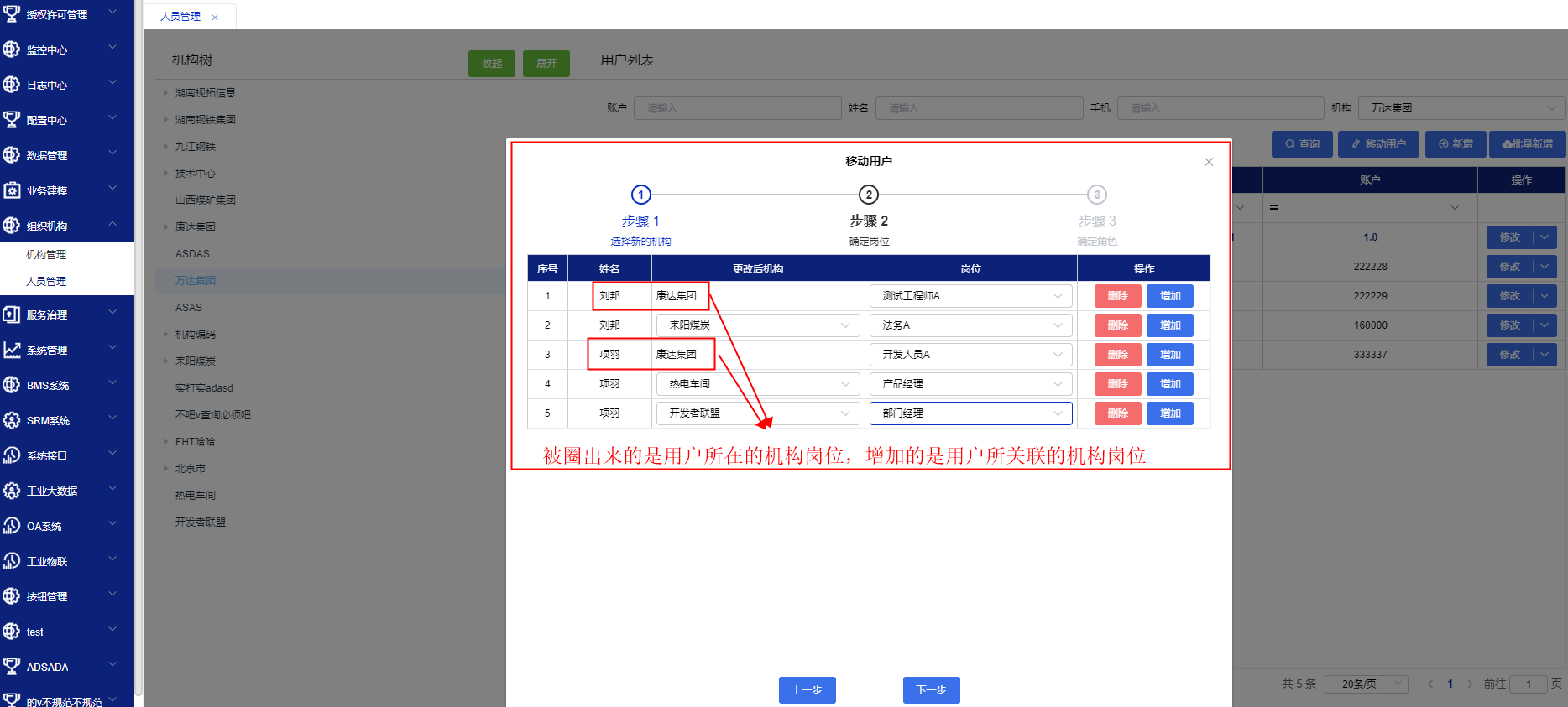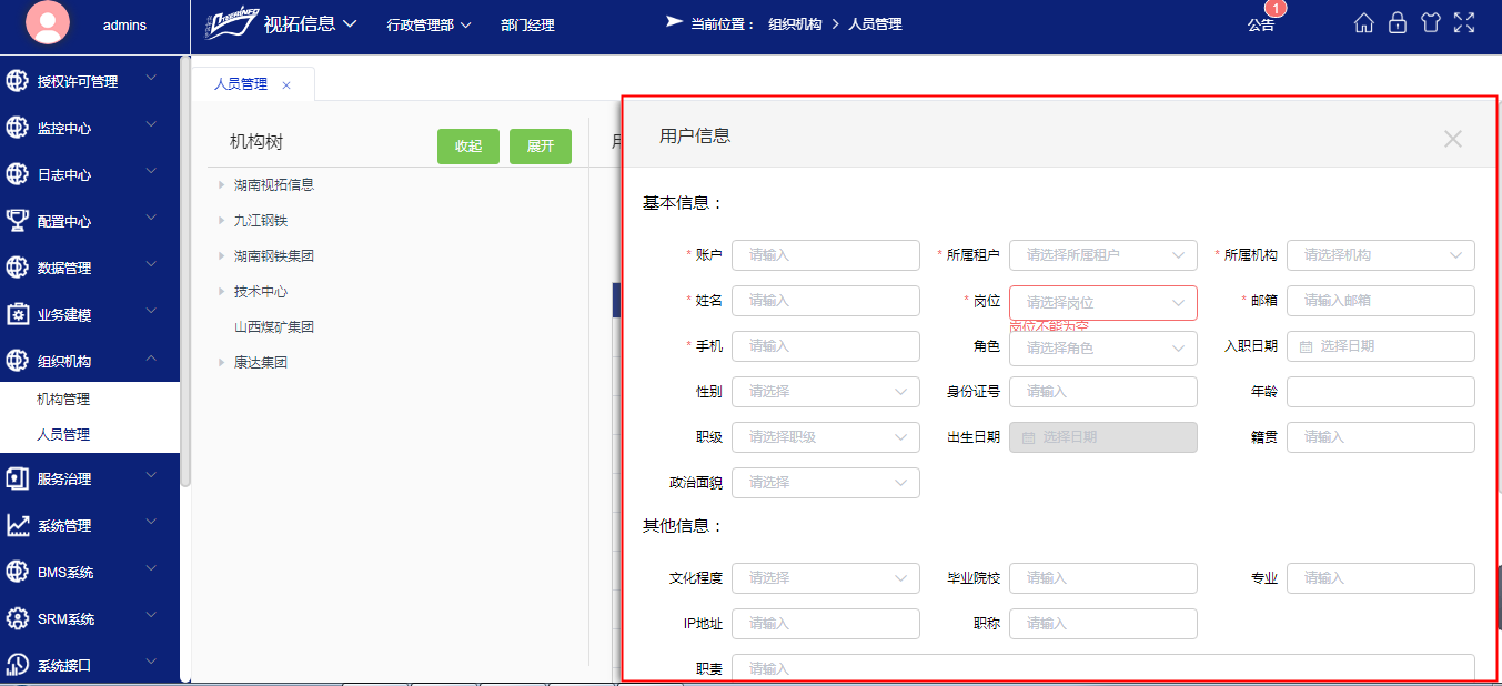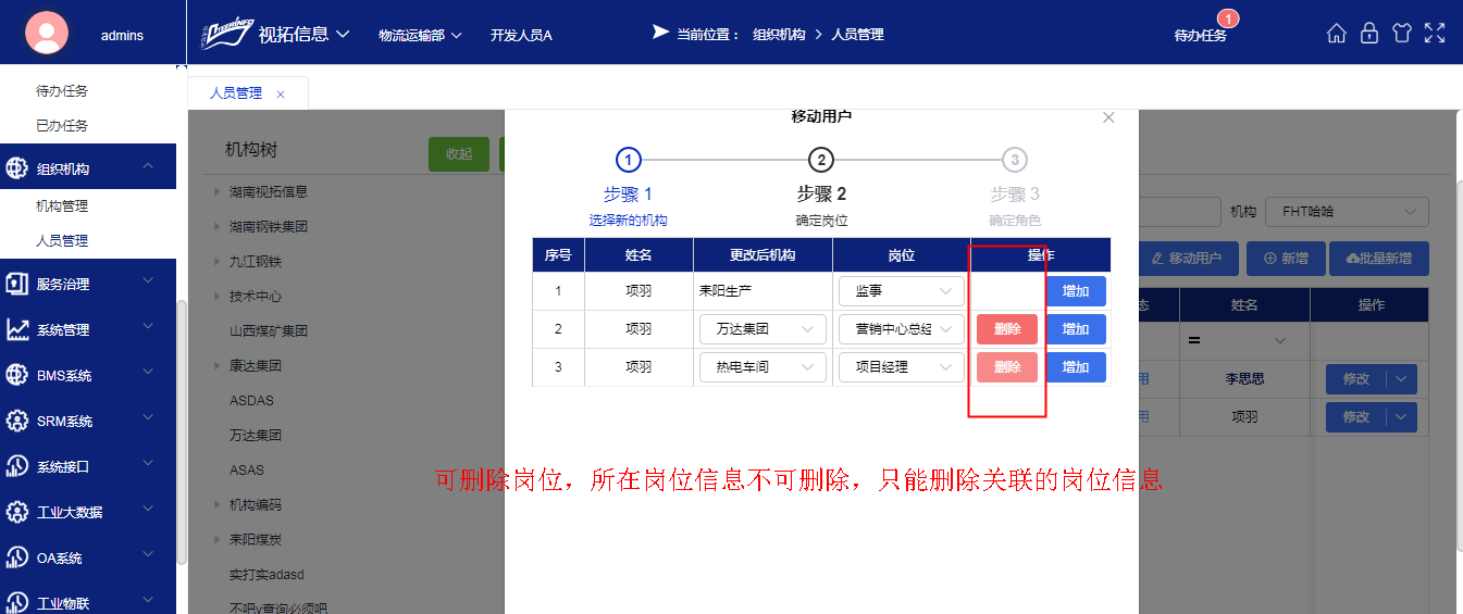点击“增加”按钮可以新增多个机构和岗位;一个用户可以关联多个机构和岗位(注:一个机构只能对应一个岗位)如下图所示: